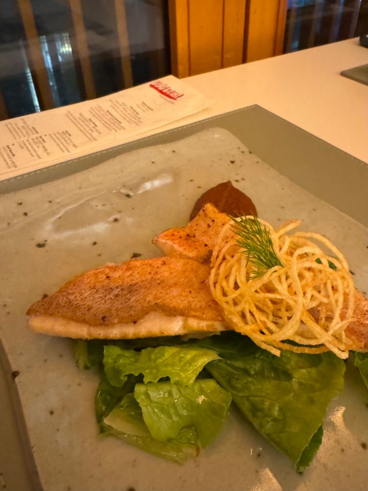 この日、メインに選んだのは白身魚スズキをカリッと焼き付けたもの。フルーティなペッパーソースとのコンビネーションが絶妙でした。そして写真を撮り忘れてしまったのが痛恨のミス! 一緒に出されたごはんは石釜で炊かれたふかっふかのガーリックライスでした。ガーリックライスとはいえ、いわゆるパンチの効いた✊というものではなく優しい味で、これまたメイン料理と一緒に食べた時の相性が最高だったのです。なんだか、日本人の舌にとても合った、というか。
