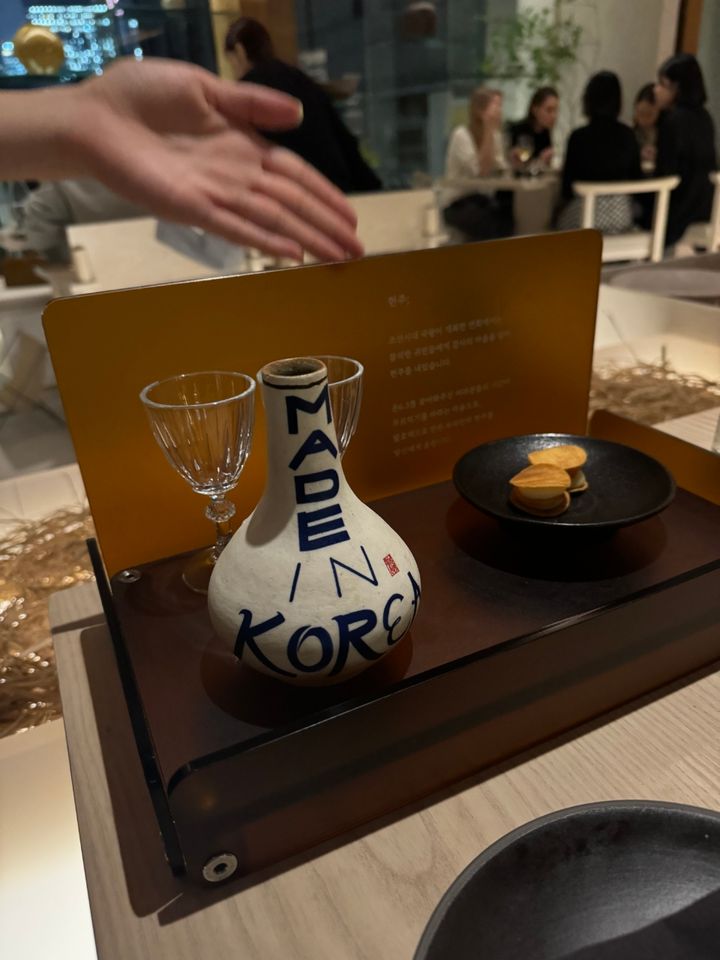 アプリ「CATCH TABLE GLOBAL」で予約していた名前を入り口で伝えて入店。テーブルに案内されて、まず出てきたのがこちらのウェルカムドリンクとフィンガーフード。これは、朝鮮時代の国王が宴の開始に、感謝の意を込めて来賓に献酒を振る舞っていたしきたりを汲んだもの。とはいえ中身はノンアルで、紫蘇の入ったサッパリとした味わいのドリンクでした。フィンガーフードは、さつまいもチップスでキムチとムースを挟んだもの。コレ、オカワリ、チュセヨ。