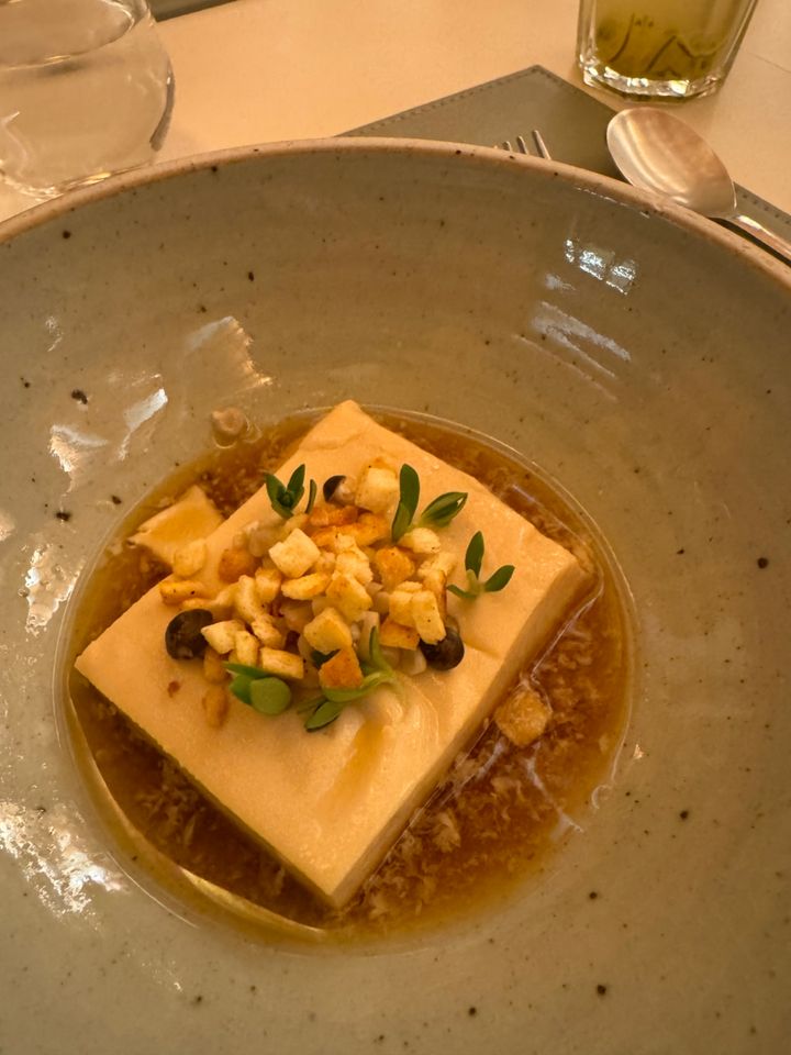 2品目はのこちらは、自家製豆腐にしめじのピクルスとサクサクのクルトンが乗ったもの。あと5皿欲しかったやつ。優しい味が胃袋に沁みました。