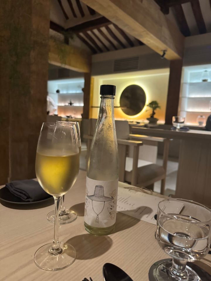 ワインとのペアリングを売りにしたお店なので、ドリンクオーダーは1テーブル=ボトルワイン1本以上のルールに。これは予約時に、あらかじめ承諾を求められます😇 ワインリストはシャンパンから、白、赤、ナチュールまで幅広いラインナップ。想像しながらゆっくり悩むのも、実にいい時間。この日はおすすめをスタッフの方に聞き、韓国産のものでキウイフレーバーのものをチョイス。ワーホリ中という日本人の女性スタッフさんがいて、心強かった。