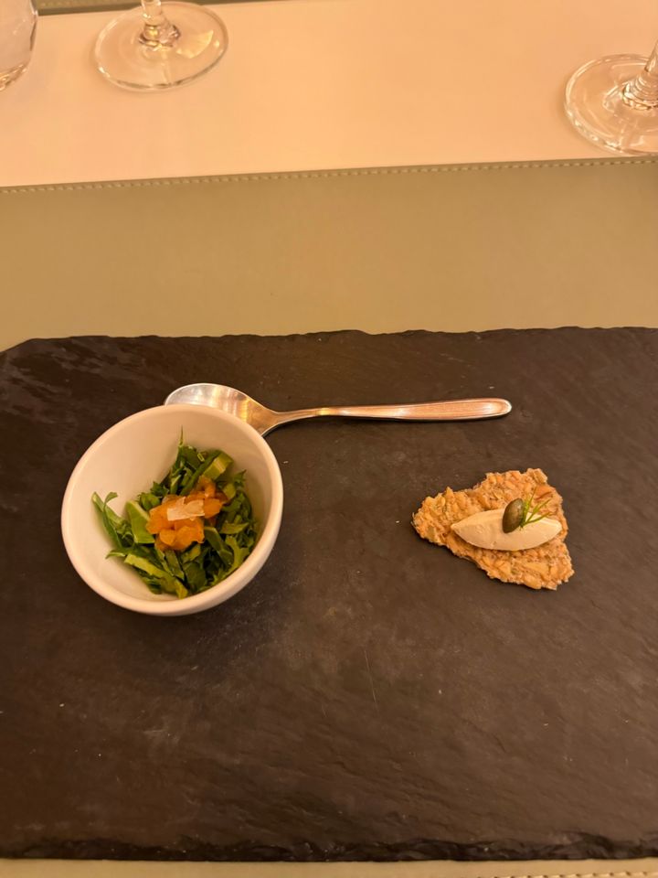 最初のアミューズ。石の器に盛られた、なんとも美しいお姿。素材そのものを楽しむ2種からスタート。内容はごめんなさい……、説明の韓国語を聞き取ることができませんでしたTT