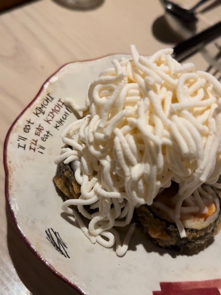 さて、突然ですがこちらは何でしょう? これは、料理なの? お菓子なの? さすが韓国! やはりビジュアルを裏切りません。こちらは、お店のシグネチャーメニュー「キムチの天ぷら(フライ)」になります。で、下のものが見えないほどかかっている、この白い物体は……?