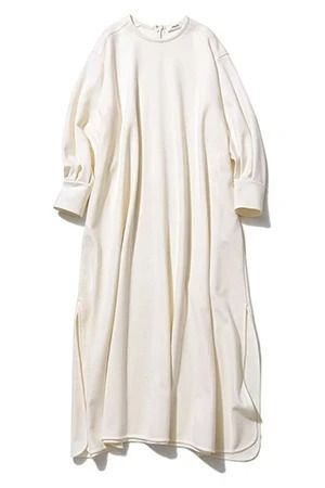 「どんな形を選んでも上質な雰囲気をもたらすウール調なら、多少遊んでもハズしすぎない装いが可能。形によりますが、起毛感がひかえめだと、洗練さがより強くて合わせやすい。このワンピースは、透けにくい程度の厚みを持たせた上質な白のウール素材。カフスデザインが洗練さを助長」(岩田さん)