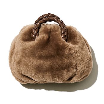 「手軽に秋冬っぽさを吹き込める、あったか素材が今季の気分。持ち手のないファーバッグは、手が滑って持ちづらいことも。長すぎないハンドルつきなら、手を通せばクラッチ持ちもしやすく便利」(出口さん)