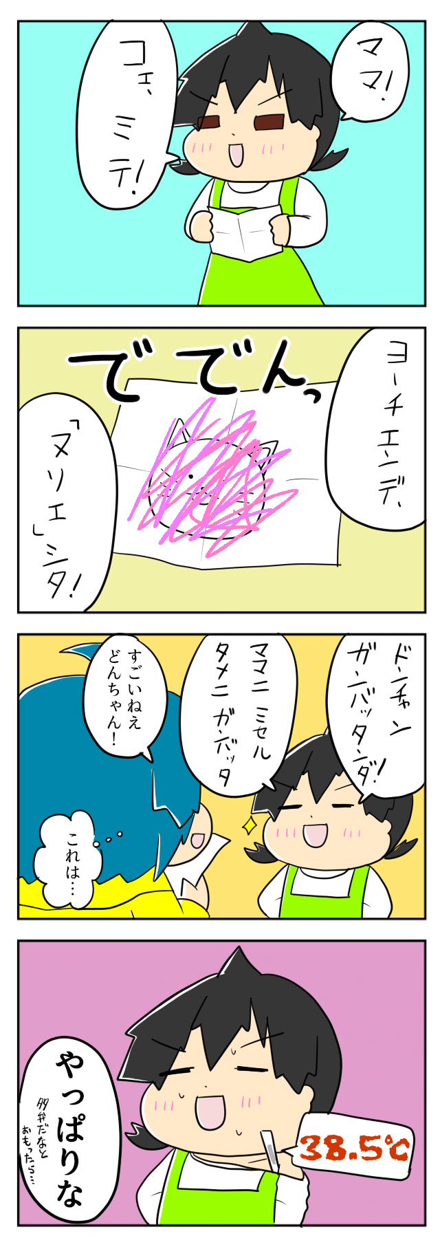 2016年生まれの兄ぽこちゃん、2018年生まれの妹どんちゃんのママであるmochikoさんから、体調が怪しいときのお話です。幼稚園で描いてきたぬり絵を見せてくれるどんちゃんを見ていたmochikoさんはなんだか違和感を感じて・・・。