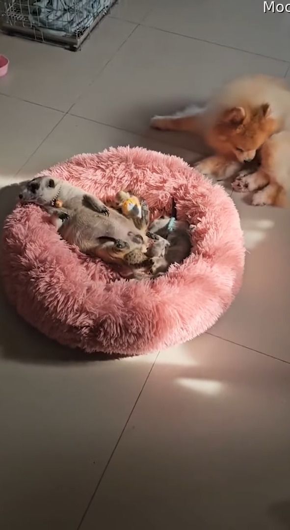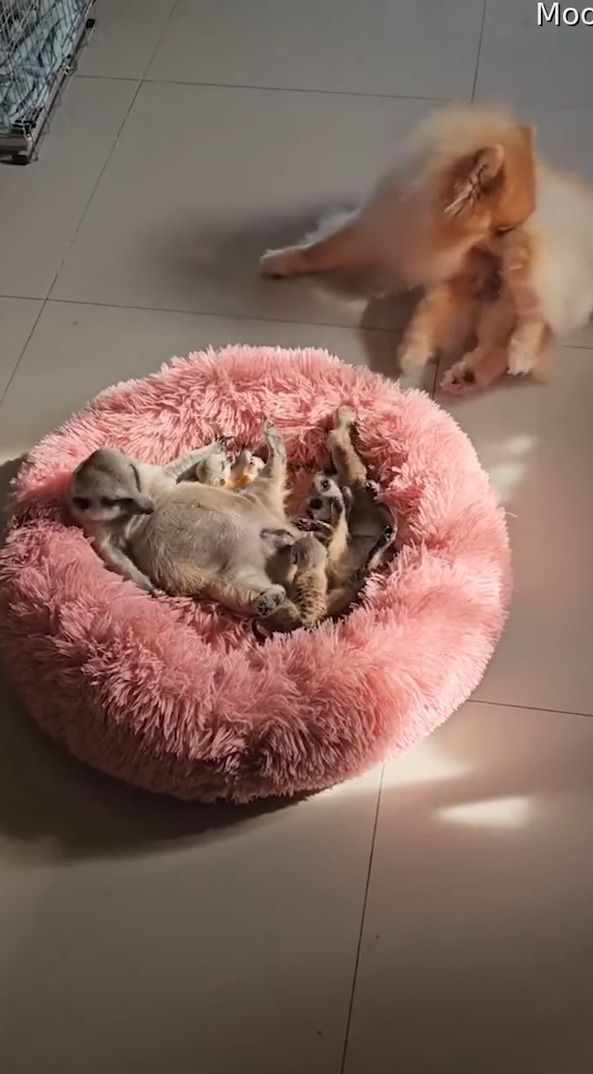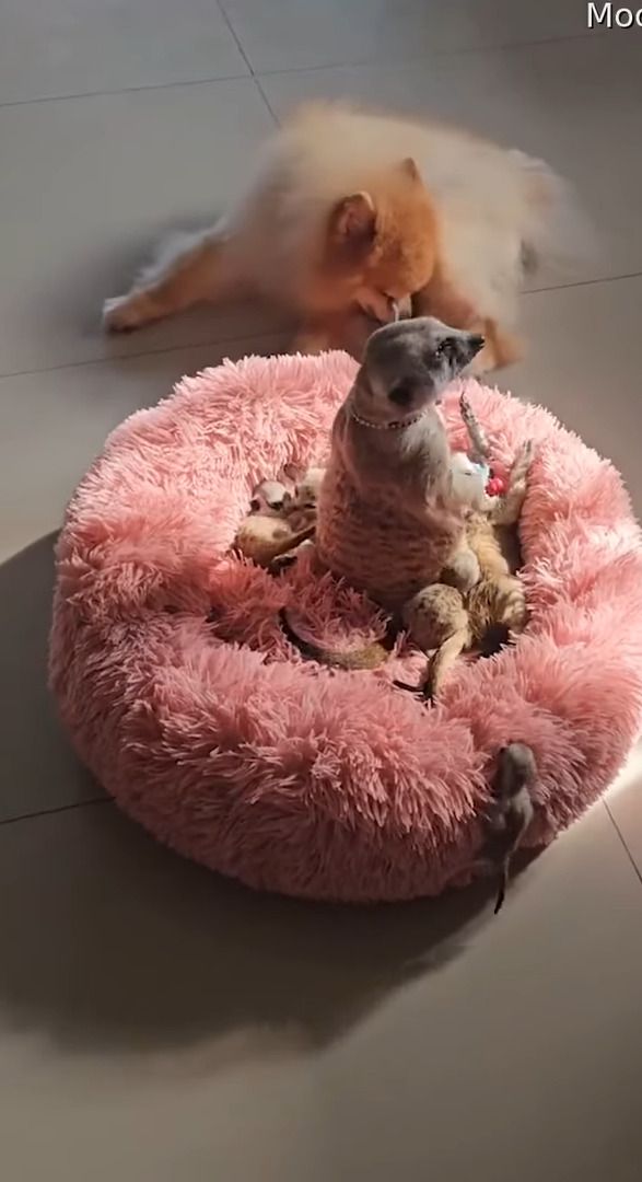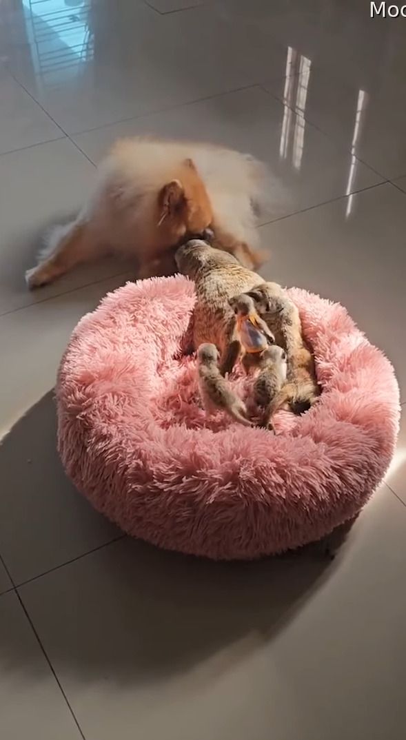 もこもこのベッドで過ごすミーアキャットとその赤ちゃんたち。 自由に動き回る赤ちゃんたちのすぐそばには、モフモフな毛並みをした愛犬もいますよ!