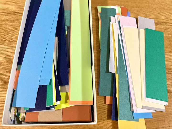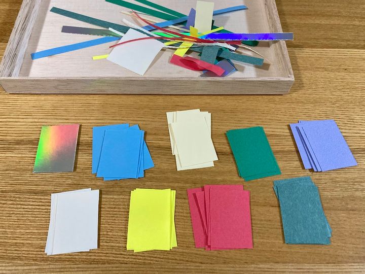 いろんな色や手触りの紙をひとまず切ってみました。ここから16枚をランダムに選んでいくことにします。
