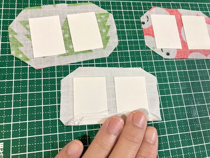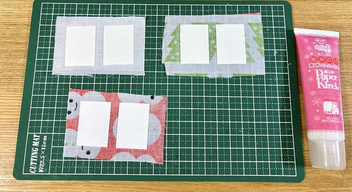 布を裏向けて、はがきくらいの厚さの紙(たて3.5cm×よこ2.5cm)を2枚、のりで貼ります。2枚のあいだは5mm程度あけてください。
