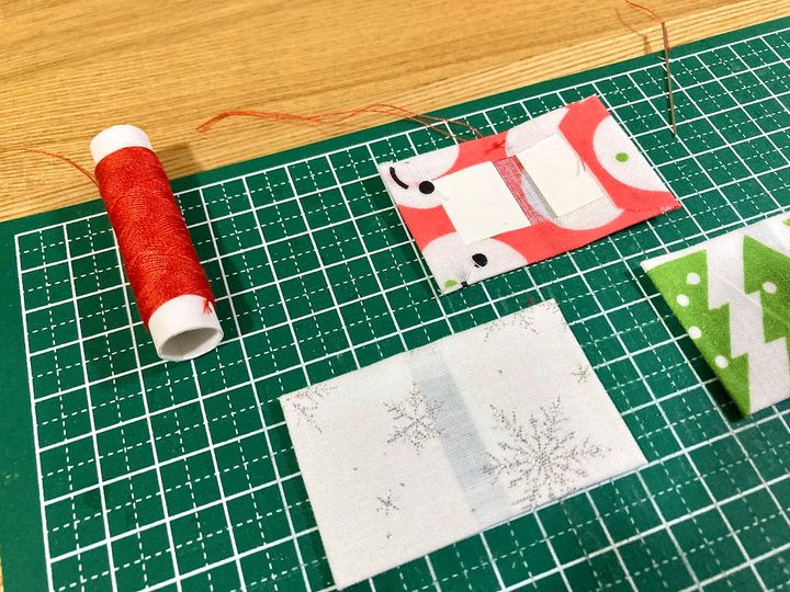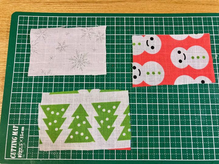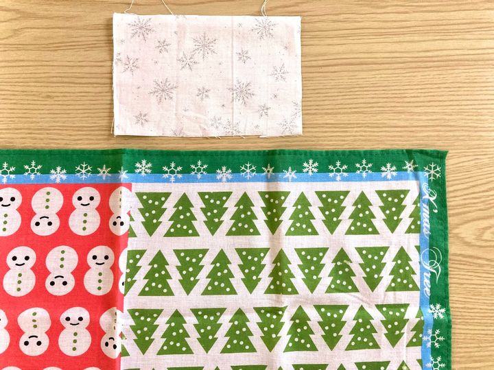 豆本の表紙には布を使います。わたしは家にあった雪の結晶のはぎれと、セリアのクリスマスコーナーでハンカチを買いました。雪だるまとツリーのふたつの柄が入っていたので、1枚のハンカチで2種類の豆本が作れます。