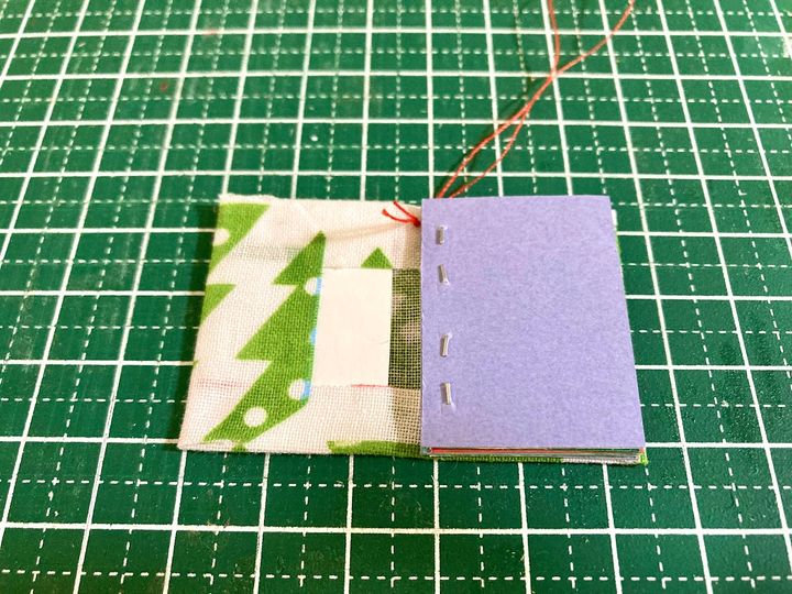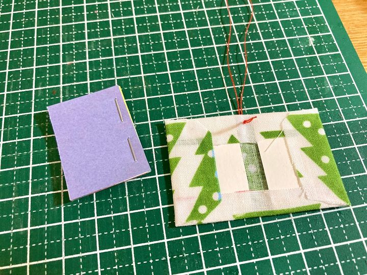 貼り終わったら、表紙の完成。そのまま表紙の裏側から、二本取りの糸を通した針を刺し、とれないように両端を結びます。これがオーナメントとしてつりさげる用の糸になります。