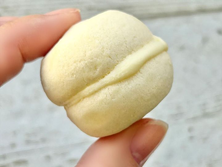 袋から取り出すと、中から出てきたのは、雪のように真っ白なお菓子。マカロンのようなコロンとしたボディが特徴です。