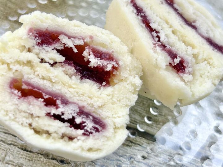 中に入っているのは、フランボワーズソース。甘酸っぱいフランボワーズソースが、ホワイトチョコのクッキーのやさしい甘みをより引き立て、絶妙なおいしさです。