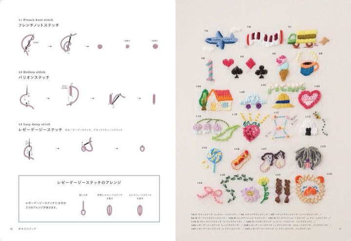 100ステッチ&100アイデアのあとには、ステッチを複数組み合わせた作品も紹介していく。いくつかのステッチを組み合わせることで、個性的な作品に近づく。