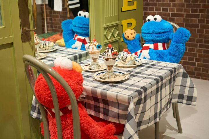 エルモとクッキーモンスターがスイーツを楽しんでいる、“フーパーズ・ストア”を再現したスポット。可愛い……。