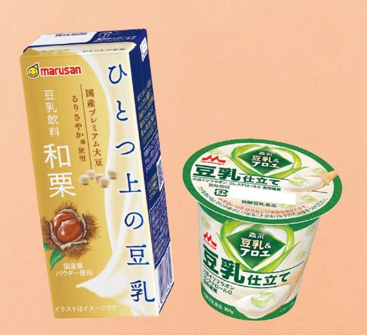 右・1個で大豆イソフラボン11mg、食物繊維1.6gが摂れる美味しくヘルシーな一品。森永豆乳&アロエ 豆乳仕立て 100g¥162*編集部調べ(森永乳業 TEL:0120・369・744) 左・厳選した国産プレミアム大豆、国産栗パウダーを使用。1本にイソフラボン25mg含有。ひとつ上の豆乳 豆乳飲料 和栗 200ml¥119*編集部調べ(マルサンアイ TEL:0120・92・2503)