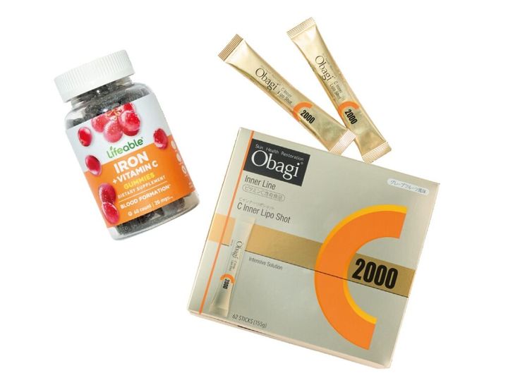 右・厳選した3種類のビタミンCと4種類の美容サポート成分を配合。オバジC インナーリポショット 62本入り¥8,370ロート通販限定(オバジコール TEL:03・5442・6098) 左・ビタミンCと鉄分を手軽に摂れるグミタイプ。Lifeable Iron+VitaminC Gummies Natural Grape 10mg 60粒入り¥1,861*編集部調べ(iHerb )