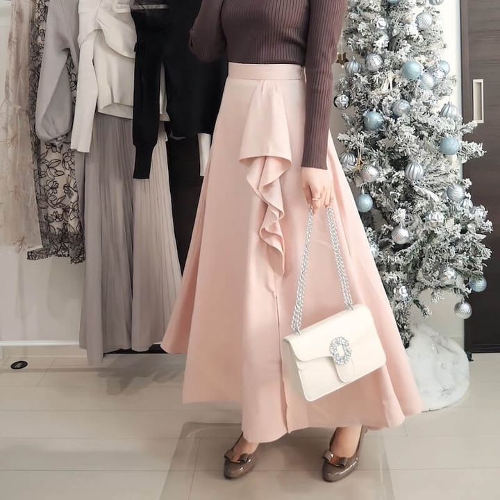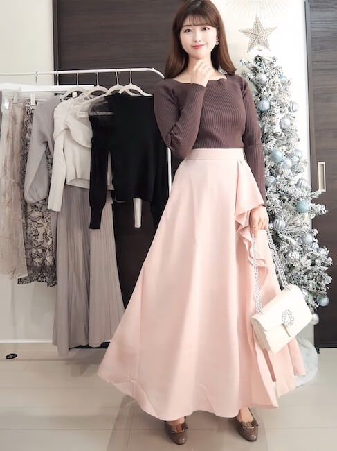 バレンタインを意識したチョコカラーとピンクを合わせたコーディネート。顔周りがスッキリみえるスクエアネックのニットはカラバリ豊富で何色あっても使えるアイテムです。スカートに合わせたのは大きなサイドフリルがポイントのフレアスカート♡ くすみのない明るいピンクで華やかな印象にしてくれます。