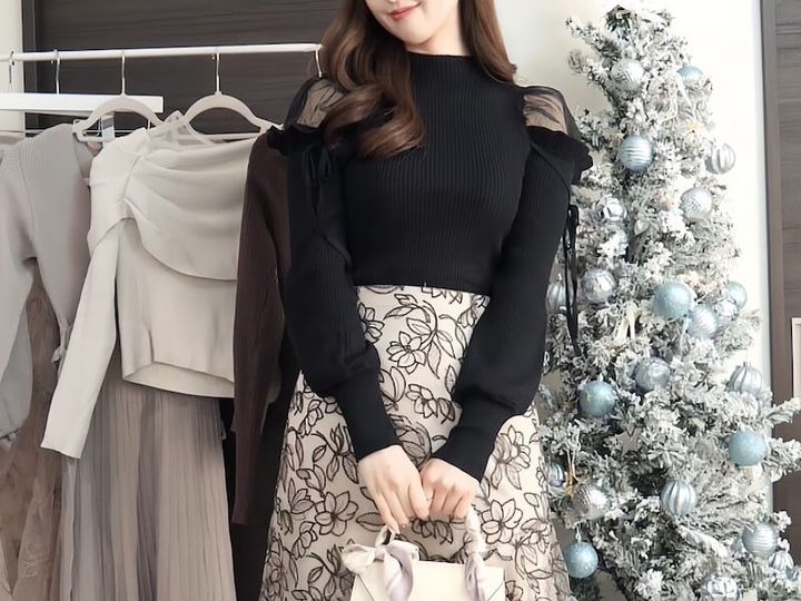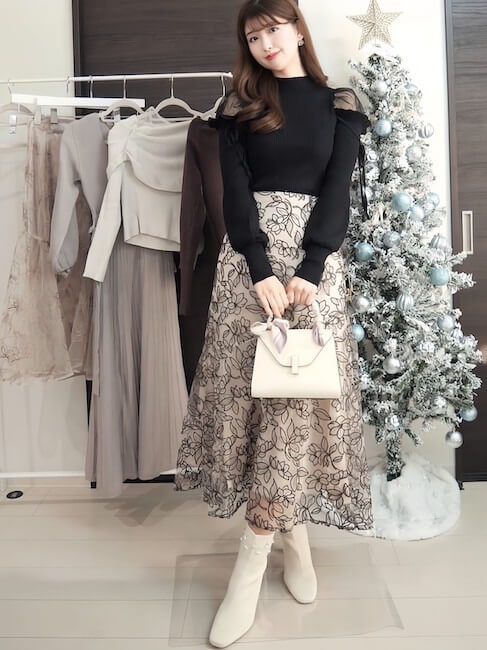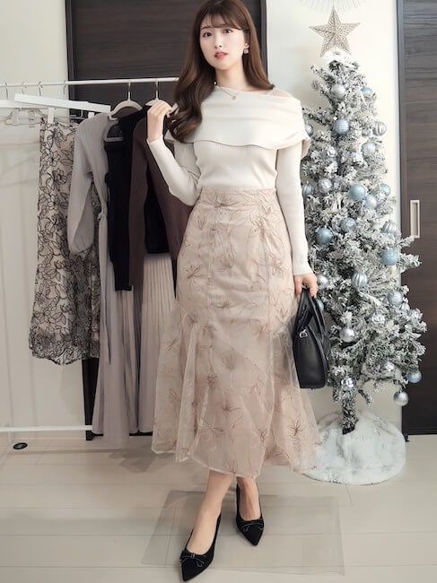 王道フェミニン派さんにおすすめのコーディネート♡ チュールに花柄の刺繍柄が大人可愛くて、膝下からふわっと広がるスカートに、片方の肩にチュールがついたアシンメトリーのニットを合わせました。