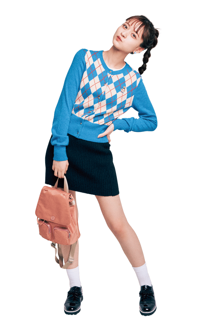 ブルーアーガイル柄カーディガン 14,960円/LILY BROWN 白ロンT 2,990円/ZARA(ザラ) 黒ニットミニスカート 8,980円/Treat Ürself イヤリング 5,670円/アビステ リュック 24,150円/minitmute(スクリーンショット) ソックス 880円/靴下屋(Tabio) ローファー 27,940円/STACCATO(バロックジャパンリミテッド)