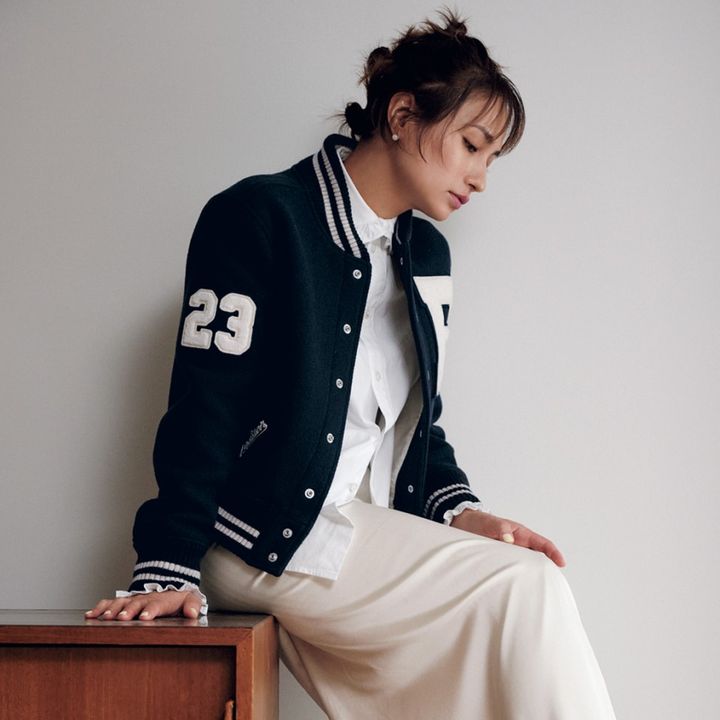プレッピーなスタジアムジャンパ―に、あえてフリルブラウスやとろみのあるスカートなど女性らしいアイテムを合わせるのがグッドバランス。ブルゾン¥242,000、ブラウス¥40,700、スカート¥93,500、スニーカー¥19,800(全てマディソンブルー)、ピアス¥39,600(エナソルーナ)、タイツは私物