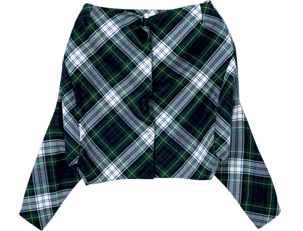 トラッドなタータンチェックにドレープがエレガントなプルオーバーは、前後、上下で着方を変えられる4WAY仕様。プルオーバー¥110,000(マディソンブルー)