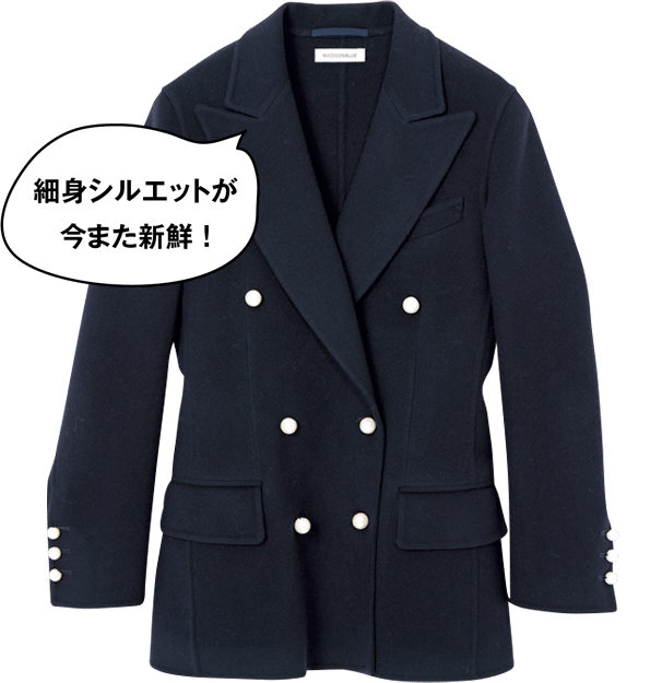 マディソンブルーを象徴する、パール調ボタンが映えるリバージャケット。ウエストシェイプのシルエットがスタイルアップも叶えてくれる。ウールジャケット¥167,200(マディソンブルー)