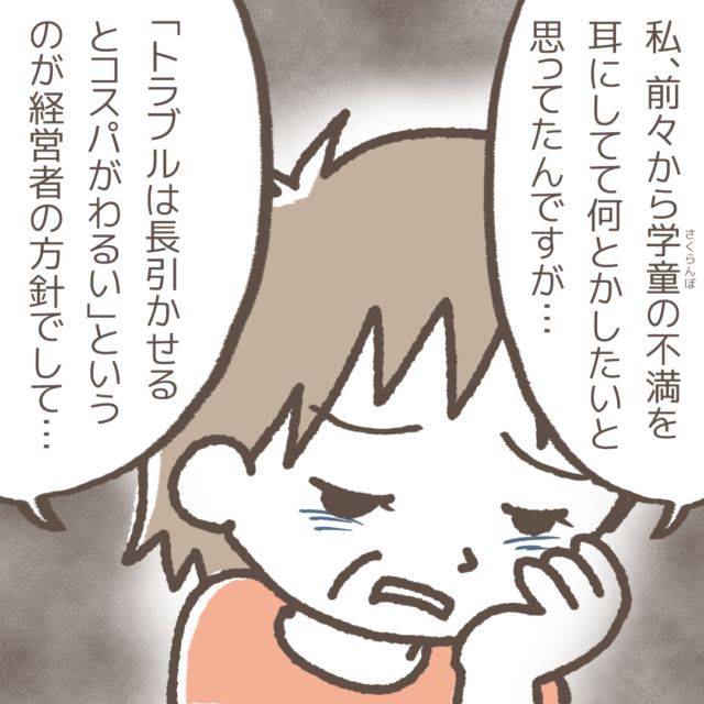 娘ちゃんが学童を退所してしばらく経った頃、買い物帰りに偶然学童の指導員米田先生に会い喫茶店で話すことになった赤井ふみさん。娘ちゃんが学童を辞めるきっかけとなった出来事について力になれなかったことを謝る米田先生は、「私、学童の今のナァナァで終わらせる状況が許せません。なので今、企んでることがあるんです・・・」と神妙な面持ちで赤井ふみさんに打ち明けて・・・。