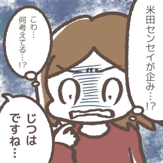 神妙な面持ちで「企んでることがある」と話す米田先生の姿に「こわ・・・」と感じた赤井ふみさん。