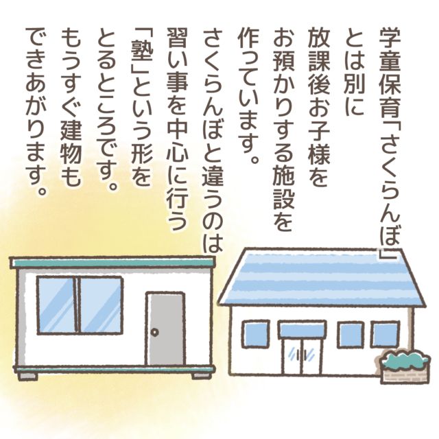 米田先生によると、娘ちゃんの通っていた学童保育「さくらんぼ」とは別に、放課後に子どもを預かる塾のような施設を作っているとのこと。