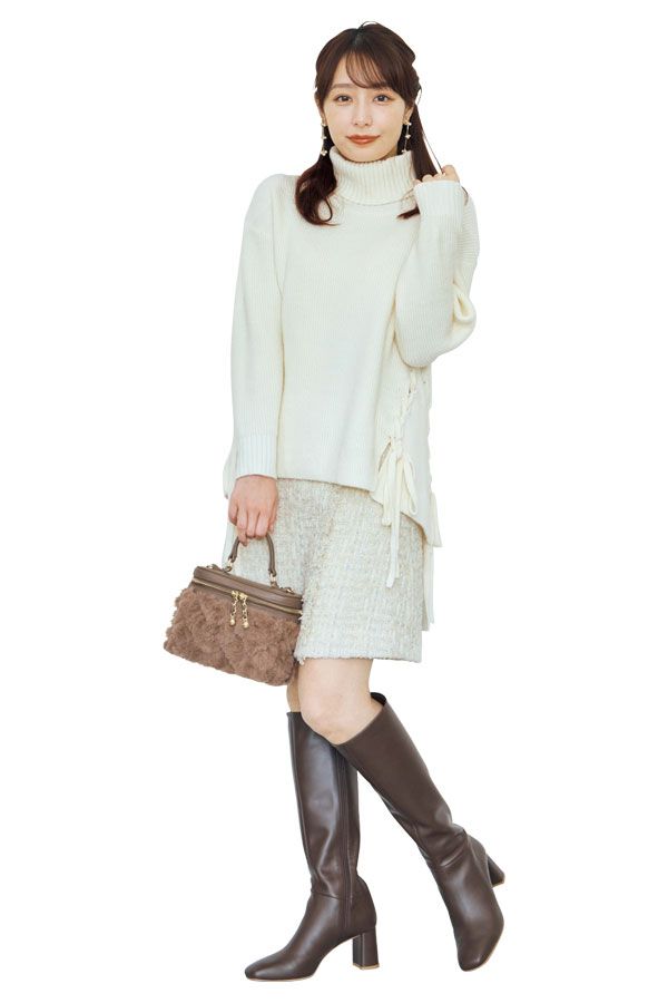 ニット¥13,200/Noëla スカート¥13,200/トゥエルブアジェンダ(TOKYO GEIMU) クリップ¥8,800/コレットマルーフ(THE HAIR BAR TOKYO) イヤリング¥2,420/アネモネ(サンポー クリエイト) バッグ¥15,400、ブーツ ¥42,350/ともにダイアナ(ダイアナ 銀座本店)