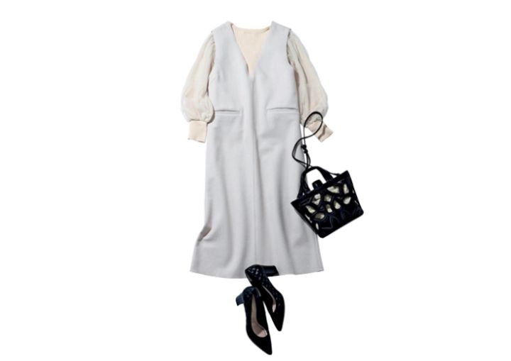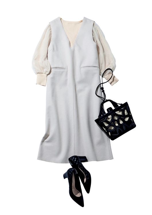 クレジット)チュールスリーブニット¥7,920 /NATURAL BEAUTY BASIC、ジャンパースカート¥7,150/オペーク ドット クリップ、カットワークバッグ¥5,990/ZARA(ザラ)、キルティングパンプス¥18,700/ダイアナ(ダイアナ 銀座本店)