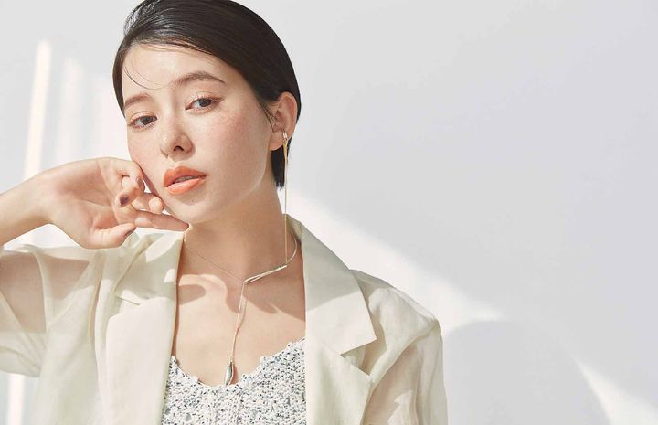 シアーシャツ ¥4,950/Neuna(アンティローザ)、ニットキャミソール ¥24,200/DOUBLE STANDARD CLOTHING(フィルム)、チョーカー ¥7,700、イヤーカフ(左耳)¥4,950/共にloni(アンティローザ)、イヤーカフ(右耳)¥2,750/ミミサンジュウサン(サンポークリエイト)