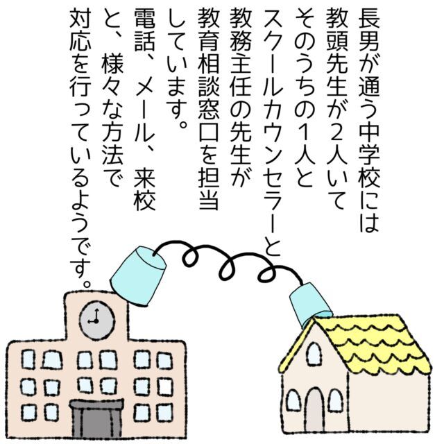 長男くんの通う中学校には、教頭先生が2人いて、そのうちの1人とスクールカウンセラー、そして教務主任の先生が教育相談窓口を担当されていました。