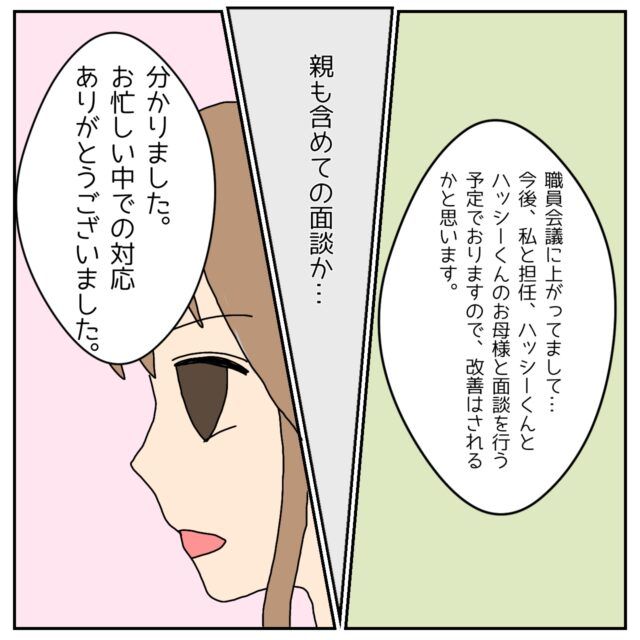 「今、職員会議に上がってまして・・。今後、私と担任、ハッシーくんとハッシーくんのお母様と面談を行う予定でおりますので、改善はされるかと思います」