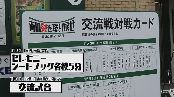 スケジュール面から甲子園では、セレモニーと各校5分間のノック練習のみを行い、交流試合は兵庫県内の各球場で行うことになりました。
