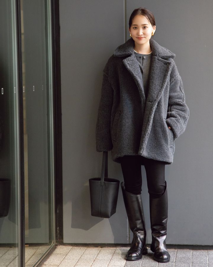 「今季ハマっているグレーを主役にスタイリング。ニットのアンサンブルがブランドの定番ですが、そこにチラッと見えるくらい、さり気ないインナーを差し込むのが今っぽくて◎。小柄なのでビッグショルダーのコートにはタイトなボトムを合わせて、シャープなバランスを意識しました」