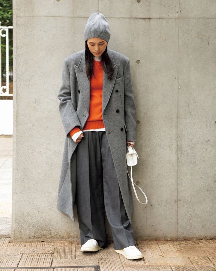 「今シーズンのトレンドであるグレーのワントーンスタイルは、着方次第でコンサバティブな印象になってしまうので、差し色で自分らしいエッセンスをプラス。コートは仕立てがダブルになっていたり、パワーショルダーになっていたり、マニッシュな1着を手に取りたい気分」