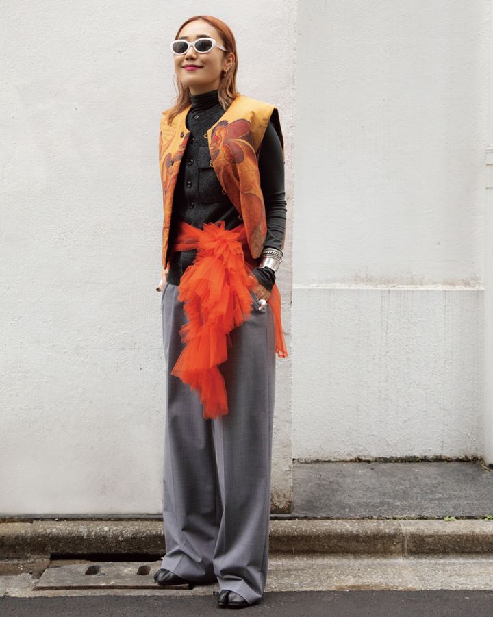 「キャッチーなアイテムも女性らしさや品の良さを保って着こなすように気を付けています。ドローイングが目を引くベストには、上質なニットやメンズライクなスラックスを合わせるなど、バランスを調整しました。チュールのブラウスで、この時期の特別なワクワク感もプラスしました」