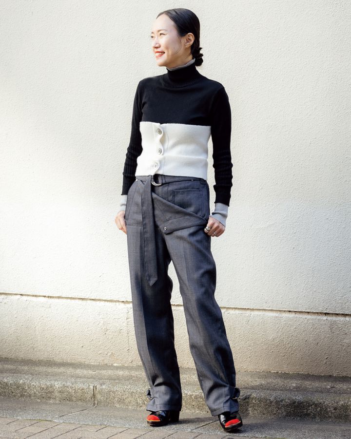 レイヤードタートルネックトップ¥31,900、ニットビスチェ¥41,800※別パーツあり、パンツ¥50,600(全てケイル)、CÉLINEのシューズは本人私物