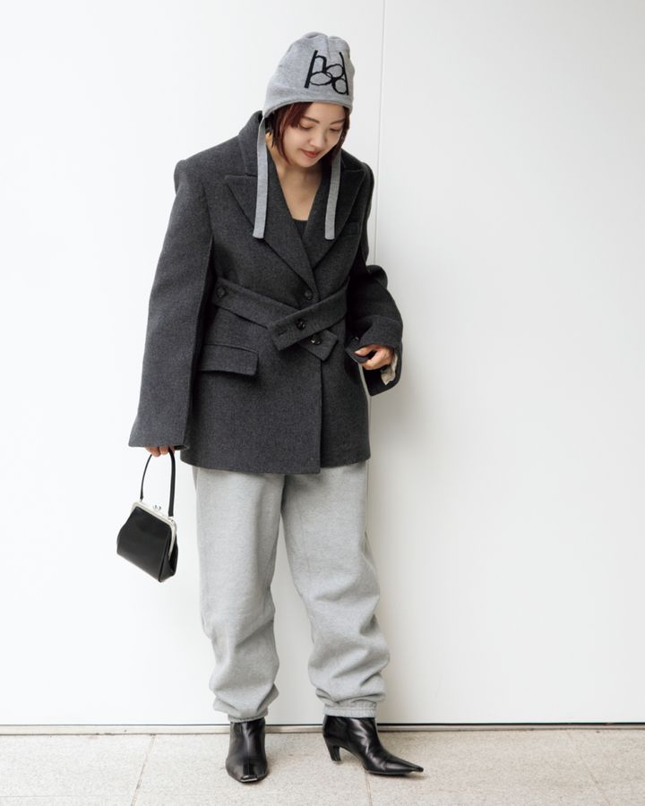「スエットパンツ × ビーニーはマイ定番。そこにアクセントになるようなカラーやアイテムでトレンドの要素をプラスしていくことが多いです。今回は旬なグレーでまとめつつ、ビッグショルダーやベストでウエストマークして、遊び心をプラス。全体的にゆったりしたサイジングなので、細身のブーツや肌見せでバランスを取りました」
