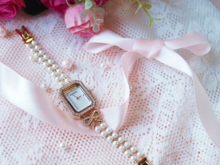 パールビーズのブレスレットには、リボンがついていて、より可愛らしさを演出してくれます。また、天然パールの文字盤は、光や角度でキラキラとして大人っぽい上品さを倍増させています…! 腕を動かすたびに、きらめくので心が躍ります。