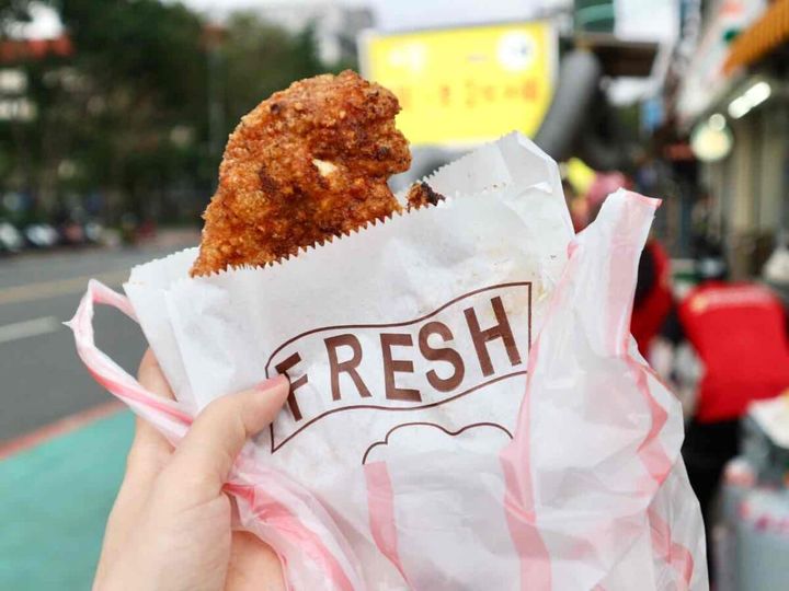 台北の巨大夜市「士林夜市(シーリンイエシー)」の入り口近くで行列ができているのが、巨大炭焼きフライドチキンの屋台「維縈家鄉碳烤雞排(ウェイインジアシャンタンカオジーパイ)」です。秘伝のタレに漬け込んだ大雞排(ダージーパイ)を油で揚げ、さらに炭焼きして提供してくれるんですよ。肉汁たっぷりのフライドチキンには甘辛いタレがしっかりとしみこんでいて、パクパクと止まらなくなっちゃいます。