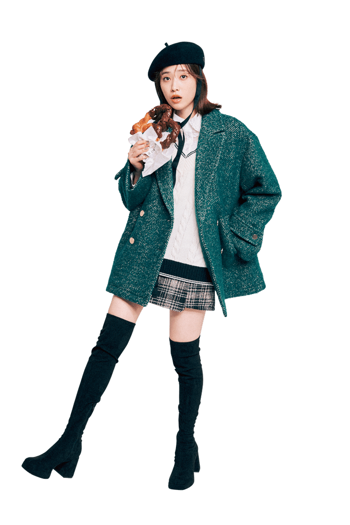 グリーンツイードコート 27,500円/レイ ビームス、ニットベスト 22,000円/フレッドペリー×レイ ビームス(ともにレイ ビームス 新宿) 白フリルブラウス 11,800円/Treat Ürself キュロットパンツ 13,530円/SNIDEL ベレー帽 33,000円/arth(OVERRIDE 神宮前店) ニーハイブーツ 15,900円/チャールズ&キース(チャールズ&キース ジャパン)