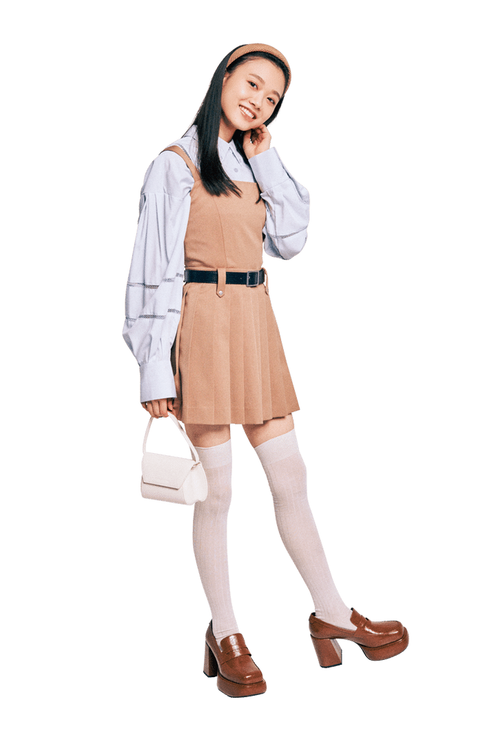 ベルトつきプリーツミニワンピース 13,200円/Darich(YSM) ライトブルーレースシャツ 14,960円/LILY BROWN カチューシャ 550円/パリスキッズ 原宿店 バッグ 7,900円、ローファー 11,500円/ともにチャールズ&キース(チャールズ&キース ジャパン) ニーハイソックス 1,760円/靴下屋(Tabio)