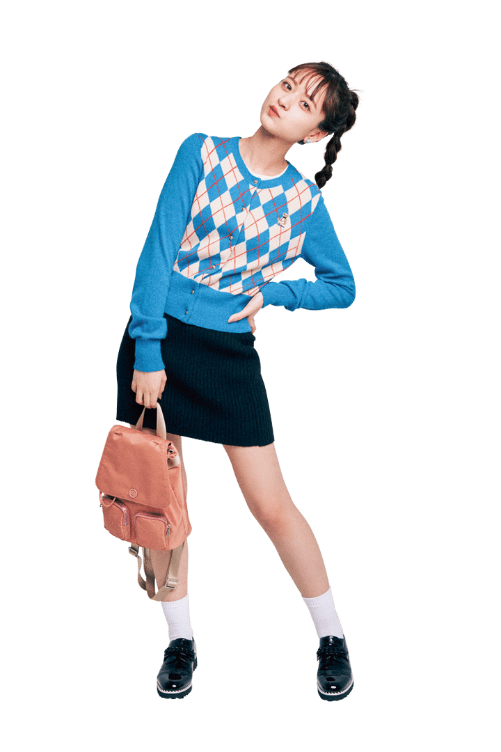 ブルーアーガイル柄カーディガン 14,960円/LILY BROWN 白ロンT 2,990円/ZARA(ザラ) 黒ニットミニスカート 8,980円/Treat Ürself イヤリング 5,670円/アビステ リュック 24,150円/minitmute(スクリーンショット) ソックス 880円/靴下屋(Tabio) ローファー 27,940円/STACCATO(バロックジャパンリミテッド)