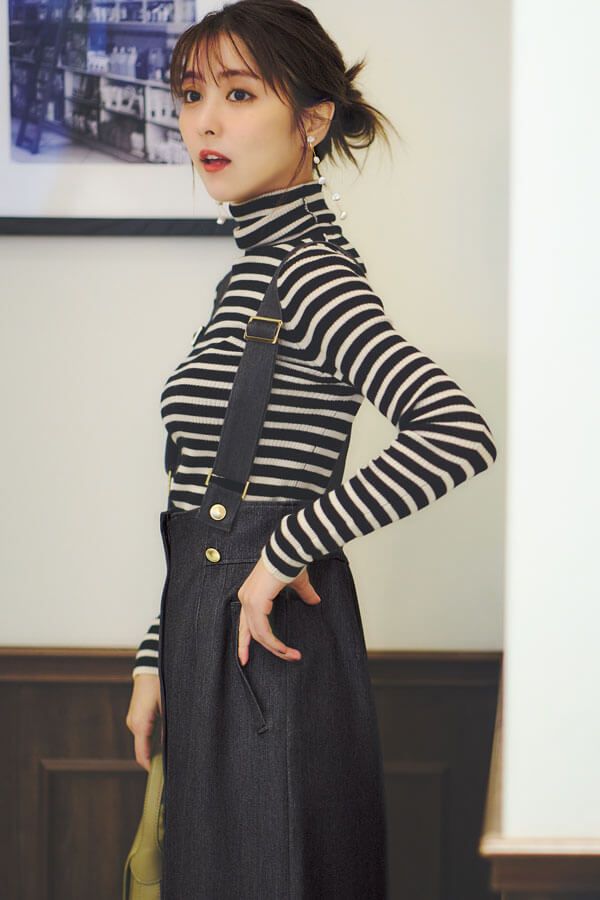 カジュアル要素の強いデザインのジャンスカにも、シンプルきれいめなジャンスカにも、意外とマッチするのがボーダーニット。タートルネックで防寒&上品さもカバー。