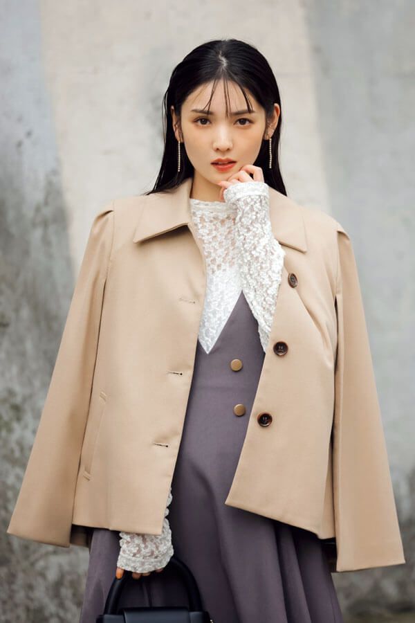 レースタートルトップス¥9,900/ジネス(ジオン商事) スリットジャケット¥17,600、ジャンパースカート¥17,600/ともにNoëla イヤリング¥2,640/ツリーピステ(ロードス) バッグ¥5,800/Olu.