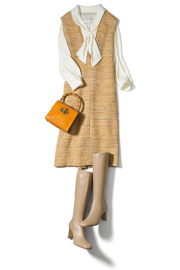 ラメ感たっぷりの季節感あるツイードジャンスカからボウタイをのぞかせてエレガントに。Vネック部分に施されたラメフリンジも、顔まわりを華やかに魅せてくれるポイントです。