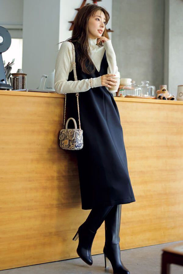 ニット¥17,600/ストロベリーフィールズ(シュガー・マトリックス) ジャンパースカート¥13,970/PROPORTION BODY DRESSING バッグ¥40,700/ジャンニ キアリーニ(ジャンニ キアリーニ 銀座店) ブーツ¥36,300/卑弥呼