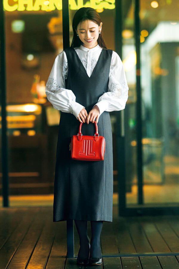 ジャンパースカート¥8,899/VIS ブラウス ¥41,800/ルル・ウィルビー(アルアバイル) イヤリング¥2,090/アネモネ(サンポークリエイト) バッグ¥31,900/ランバン オン ブルー(クイーポ) タイツ¥1,980/17°C(17°C by Blondoll 横浜ジョイナス店) 靴¥17,600/ダイアナ(ダイアナ 銀座本店)